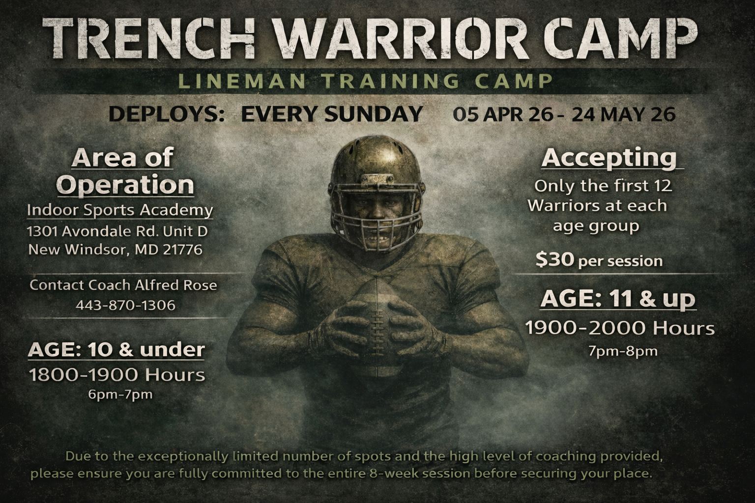 Indoor Sports Academy welcomes the Big Dogs in the trenches! We are running an exclusive offensive and defensive linemen camp this off-season. Click the flyer for details and registration.